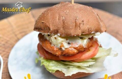 Pão australiano, 160g de hambúrguer de frango, requeijão. Alface americana e tomate fresco.