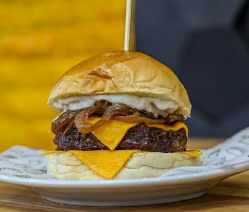 Pão de leite, 160g hambúrguer triturado c/bacon, dobro de queijo, molho parmesão, cebola agridoce.